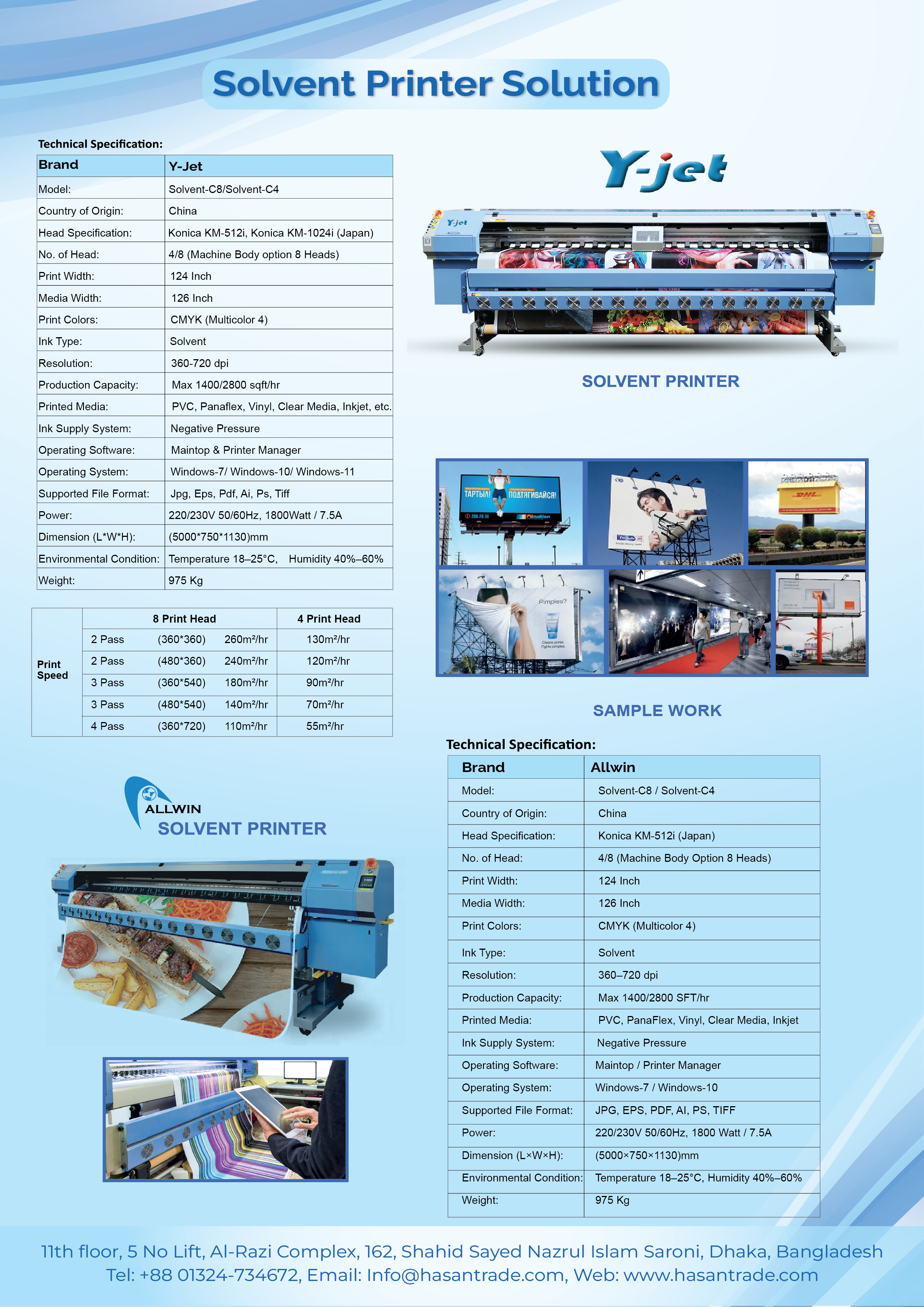 The Y-Jet Eco Solvent Printing Machine is an advanced printer designed for high-quality graphics with eco-friendly solvent inks. It produces long-lasting, waterproof, and UV-resistant prints suitable for banners, signage, labels, and apparel transfers. Known for its energy efficiency and reduced environmental impact, it delivers vibrant colors with excellent detail. This machine is perfect for businesses looking to balance quality and sustainability. With a robust design, fast printing speed, and cost-effective operation, it ensures high productivity while maintaining eco-conscious standards. The Y-Jet Eco Solvent Printing Machine is a smart choice for modern printing companies seeking durable, eco-friendly results.